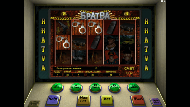 Онлайн-автомат Bratva выпущен в 2014 году. Особенность — приятное исполнение, контрастные оттенки. Разработчики Unicum взяли за основу тематики противостояние бандитов и милиции во времена Советов. Слот подойдет новичкам и опытным игрокам благодаря простоте правил, интуитивно понятному интерфейсу, широкому диапазону ставок, наличию бонусных опций. При желании гэмблеры удвоят награду посредством риск-раунда.