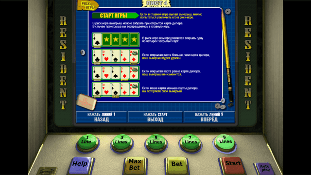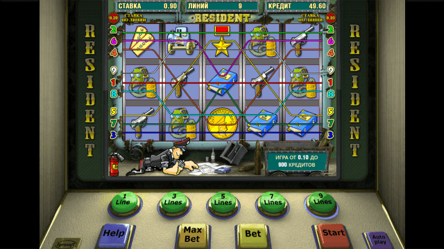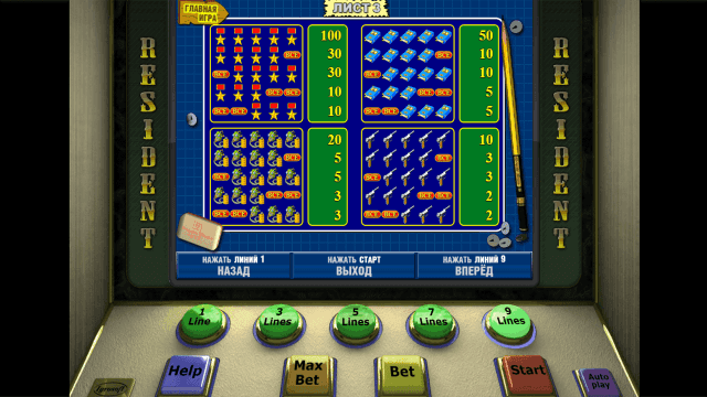 Аппарат Резидент гармонично сочетает в себе простые правила игры и увлекательные бонусные опции. Во время риск-игры пользователи в несколько раз могут увеличить сумму выплат. Приятно удивят высокие коэффициенты слота Шпион. Двухуровневая бонусная игра принесет солидные выигрыши. Недостаток виртуального аппарата — его несовременная графика и простое звуковое сопровождение.